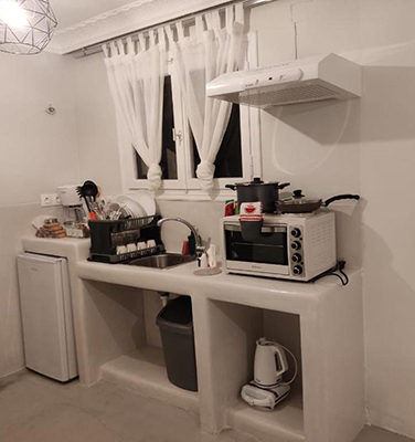 Our apartments feature a fully equipped kitchenette with everything you need to feel at home: stovetop, oven, refrigerator, coffee machine, toaster, electric kettle, and a complete set of kitchenware.